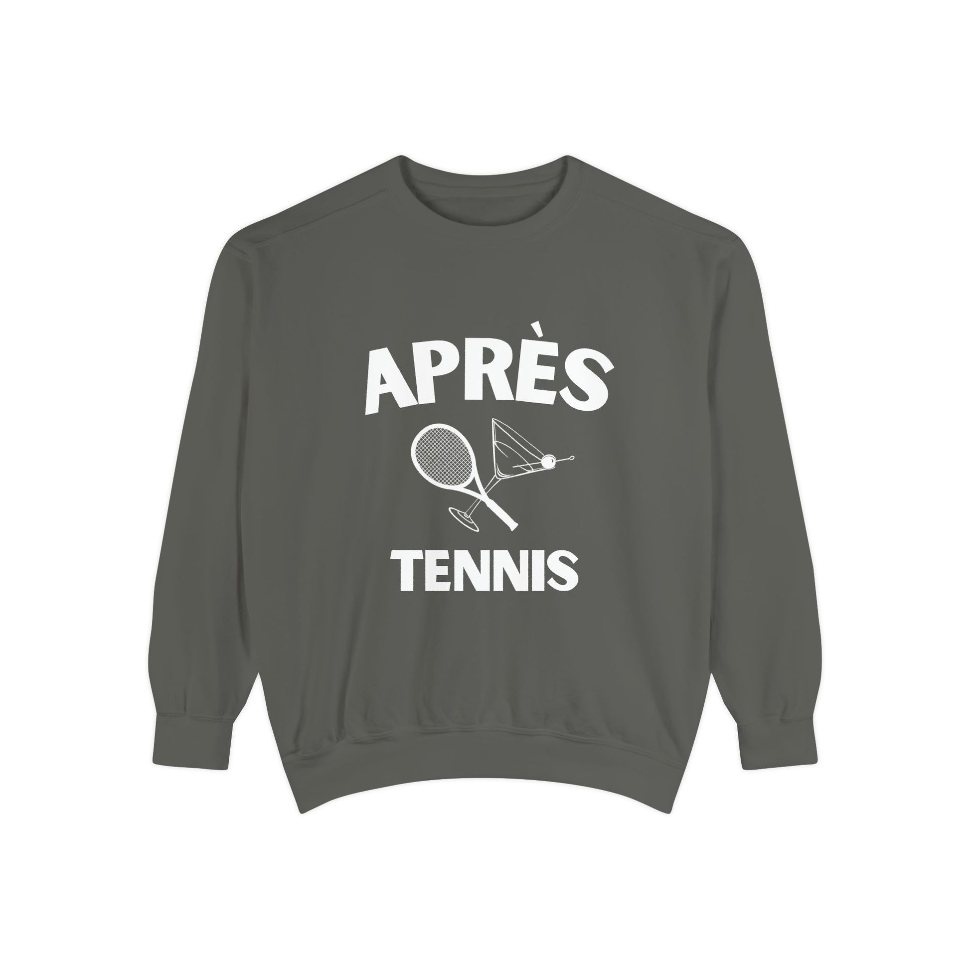 Elevate your laid-back style with this Unisex Garment-Dyed Sweatshirt, and did I mention it's Comfort colors!! This cozy yet chic piece radiates a relaxed vibe, perfect for lounging at home or enjoying a casual day out with friends. Featuring a striking 'APRÉS TENNIS' design, it showcases your passion for the sport while keeping you effortlessly stylish. Ideal for tennis enthusiasts or anyone who loves the sport's laid-back culture, this sweatshirt makes a fantastic gift for birthdays, holidays, or simply to treat yourself. Experience the comfort and unique colors that are perfect for spring and summer outings, or for cozy fall evenings. Available in a relaxed fit, it is perfect for pairing with your favorite jeans or shorts.