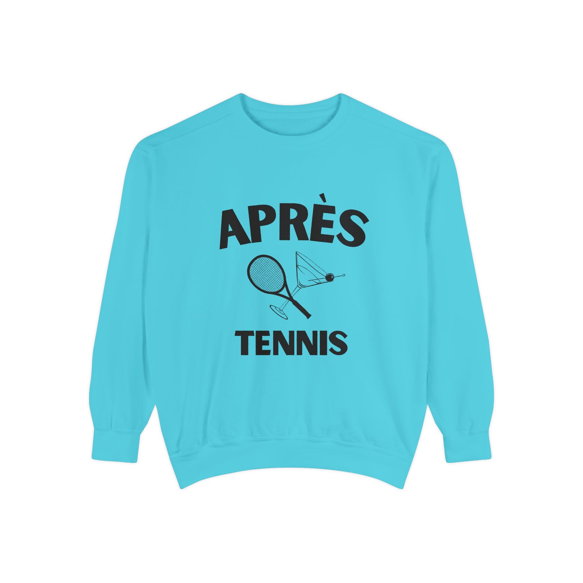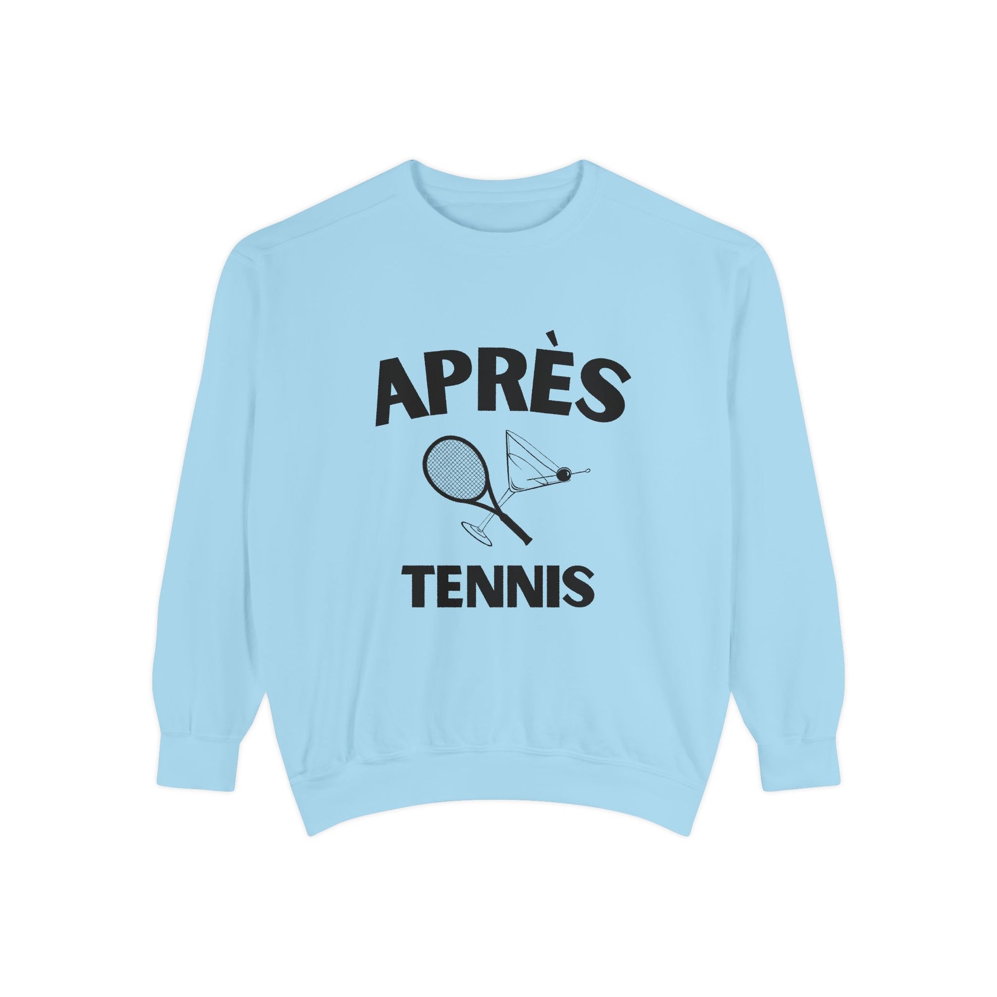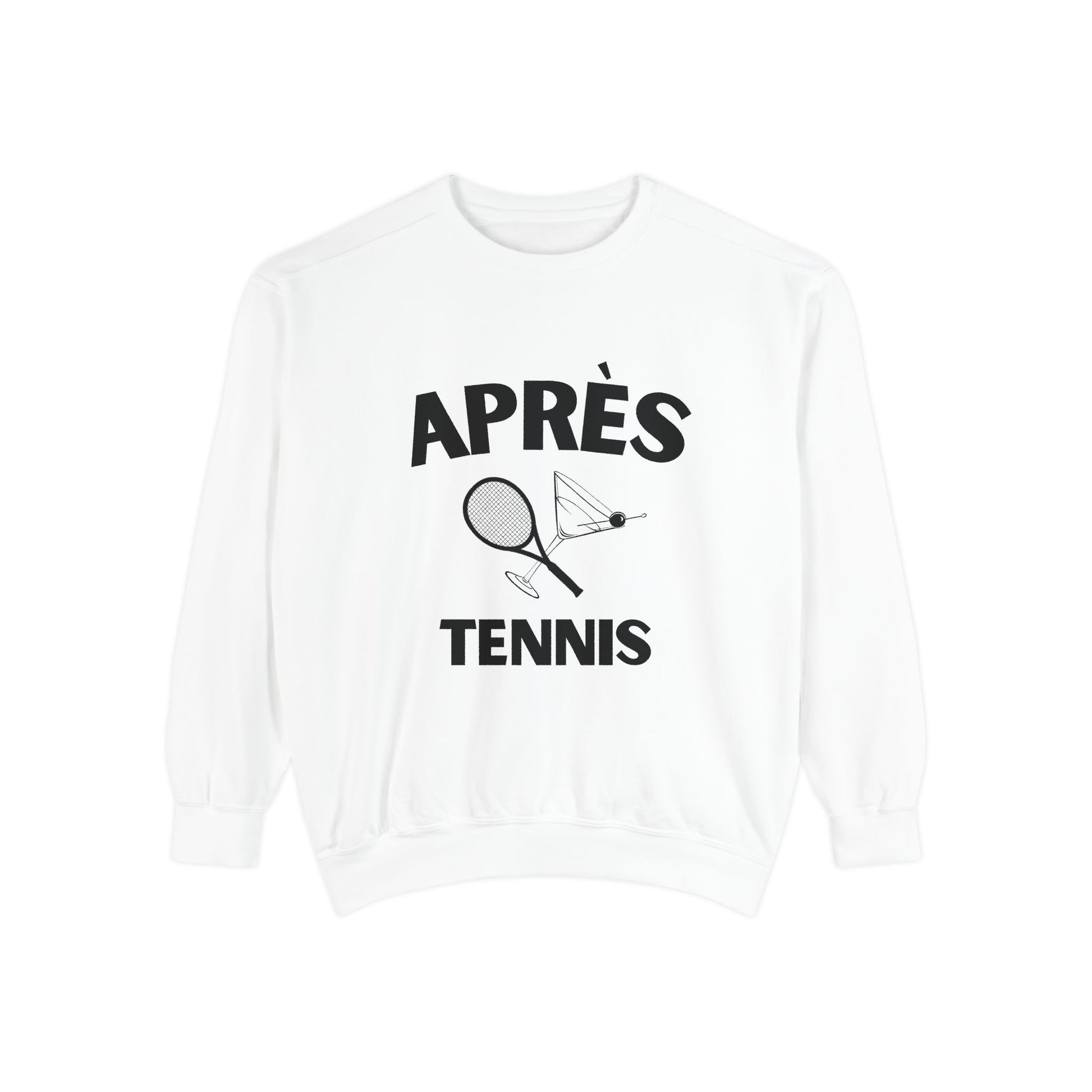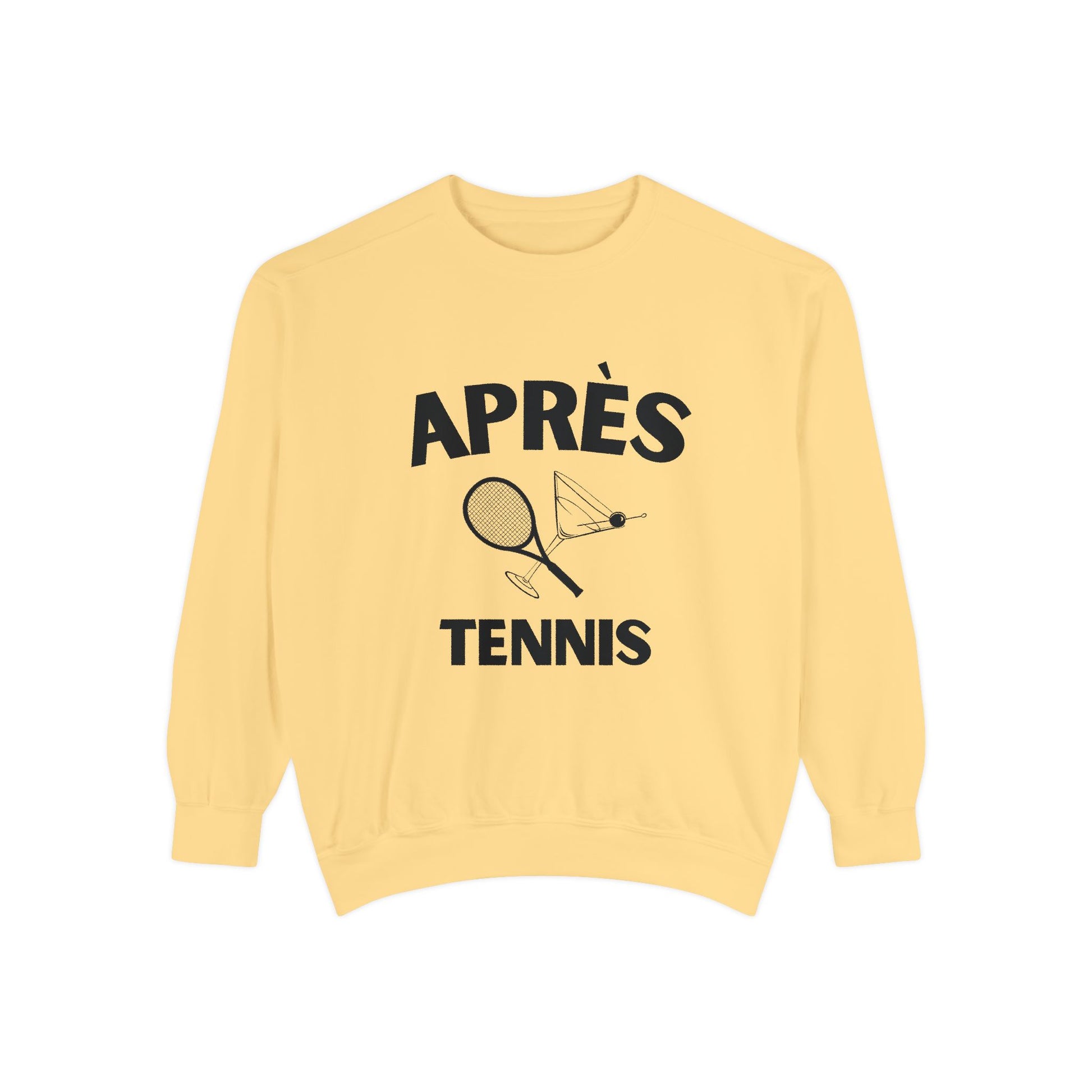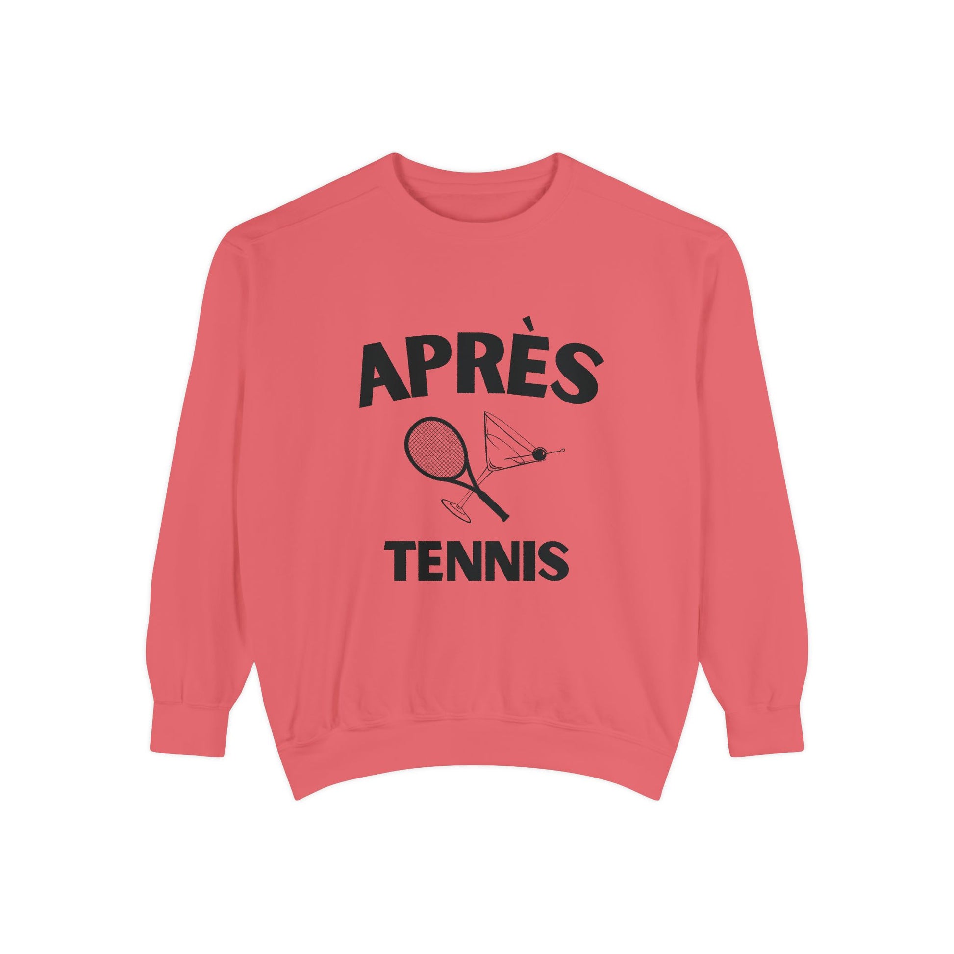 Elevate your laid-back style with this Unisex Garment-Dyed Sweatshirt, and did I mention it's Comfort colors!! This cozy yet chic piece radiates a relaxed vibe, perfect for lounging at home or enjoying a casual day out with friends. Featuring a striking 'APRÉS TENNIS' design, it showcases your passion for the sport while keeping you effortlessly stylish. Ideal for tennis enthusiasts or anyone who loves the sport's laid-back culture, this sweatshirt makes a fantastic gift for birthdays, holidays, or simply to treat yourself. Experience the comfort and unique colors that are perfect for spring and summer outings, or for cozy fall evenings. Available in a relaxed fit, it is perfect for pairing with your favorite jeans or shorts.